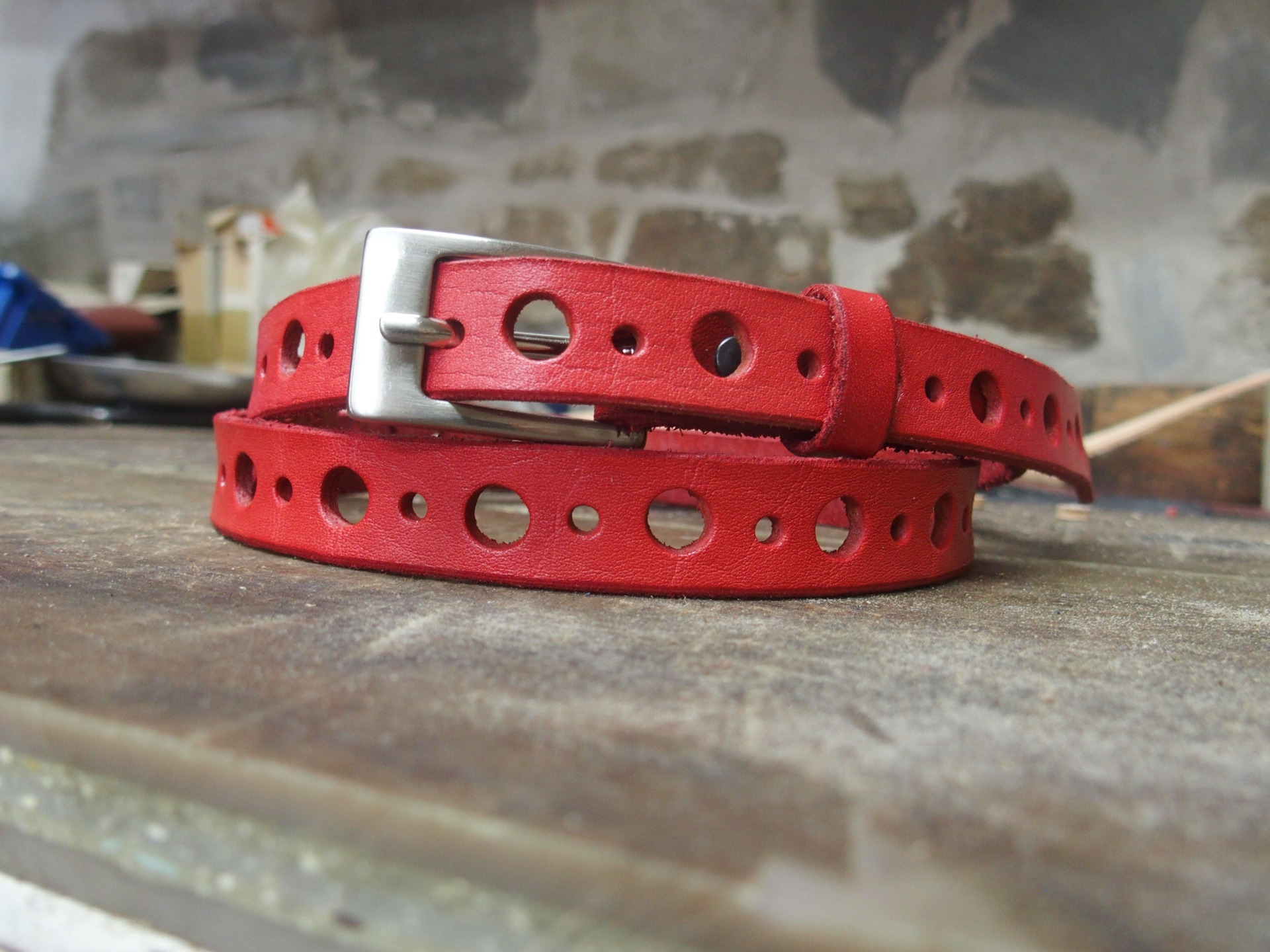 opasek červené barvy, šíře 2 cm, délka celé kožené části bez spony 110 cm-obvod pasu cca 90 cm, množství dírek však zaručuje širší i tenčí použití :)