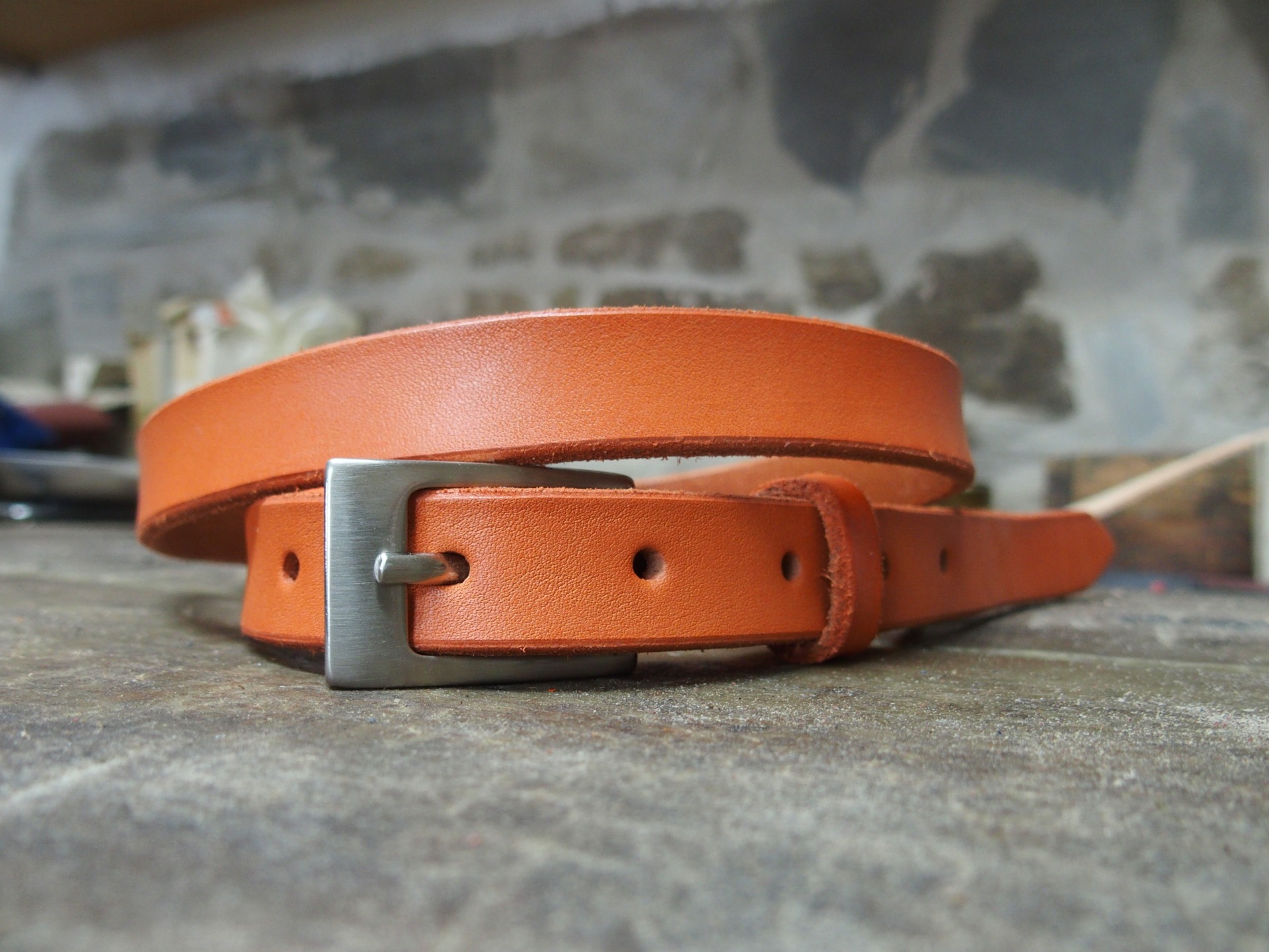 opasek světle oranžové barvy, šíře 2 cm, délka celé kožené části bez spony105 cm-obvod pasu cca 88 cm, u